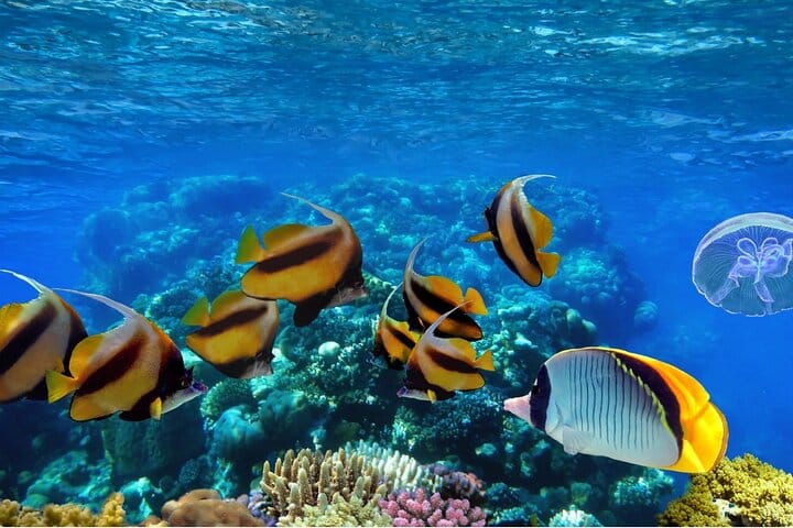 Explore the captivating underwater realm of Ras Muhammad National Park from Sharm El Sheikh. Delight in a lunch served on the boat while engaging in diving or snorkeling activities.